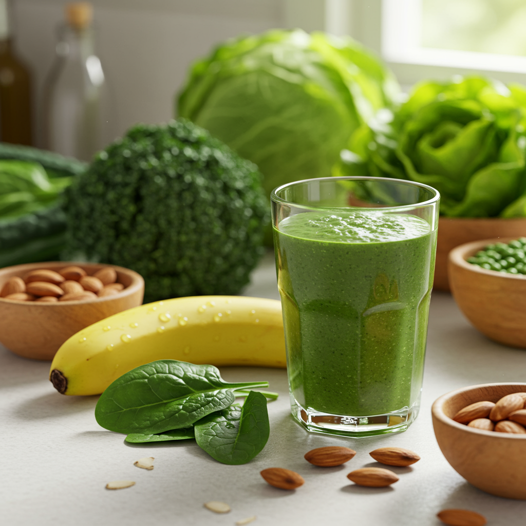 - 재료: 시금치 한 줌 (약 50g), 바나나 1개, 물 또는 저지방 우유 200ml, 견과류 한 스푼 (선택 사항)